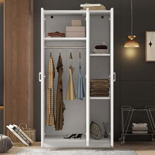 3 Door Wardrobe with Mirror, Armoire with Hanging Rod and 3 Fixed Shelves,White