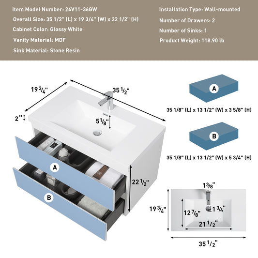 36" Floating Bathroom Vanity with Sink, Modern Wall-Mounted Bathroom Storage Vanity Cabinet with Resin Top Basin and Soft Close Drawers, Glossy White 24V11-36GW