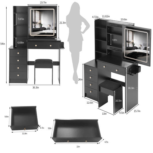 37" Middle Size Left Bedside Cabinet Vanity Table + Cushioned Stool Dresser Set, 2 AC+2 USB Socket, Hair Dryer Stand, Large Touch Control LED Sliding Mirror, 3-color Switch, EPA, GCC, UL Certificate