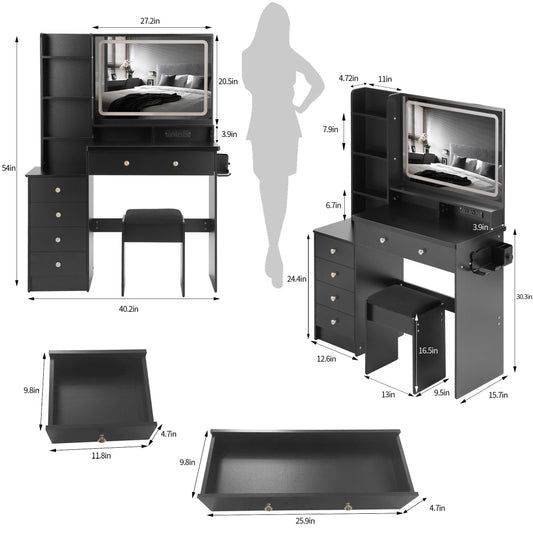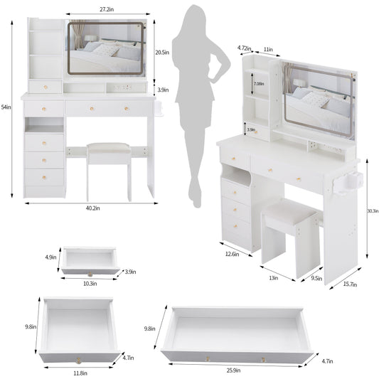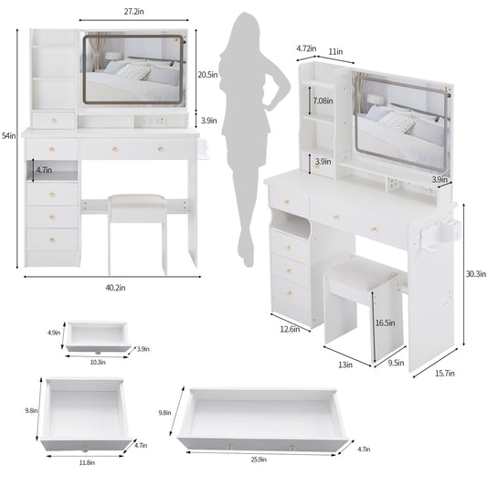 41" Large Size Left Drawer Desktop Vanity Table+Cushioned Stool Dresser Set, 2 AC+2 USB Power Station, Hair Dryer Stand, Extra Large Touch Control LED Mirror, 3-color Switch, EPA, GCC, UL Certificate