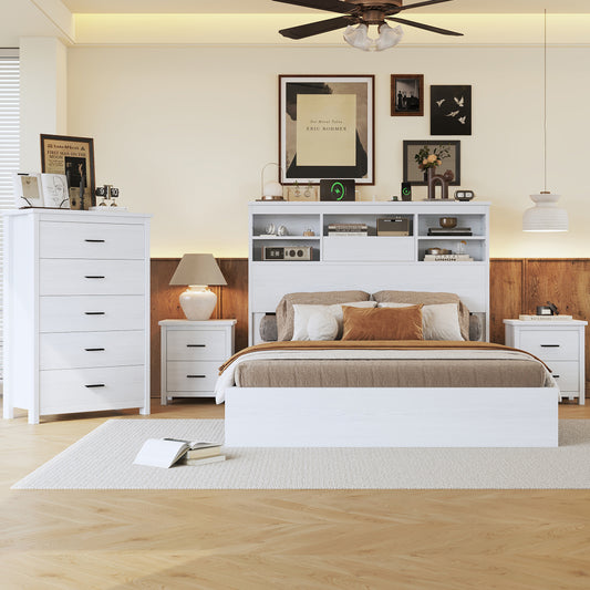 4-Pieces Bedroom Sets Queen Size Vintage Wooden Bed Frame with 2 Nightstands and 1 Dresser, White