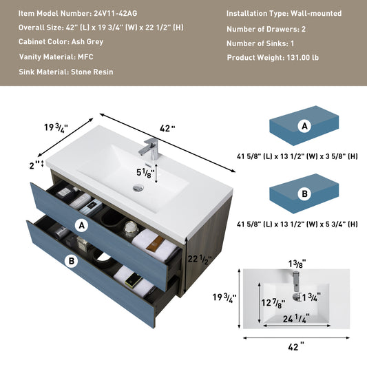 42" Floating Bathroom Vanity with Sink, Modern Wall-Mounted Bathroom Storage Vanity Cabinet with Resin Top Basin and Soft Close Drawers, Ash Grey 24V11-42AG