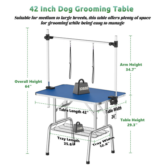42 Inch Foldable Dog Grooming Table for Home with Adjustable Arm, Noose, Non-Slip Surface, and Storage Mesh Tray