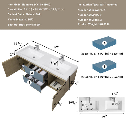 60" Floating Bathroom Vanity with Sink, Modern Wall-Mounted Bathroom Storage Vanity Cabinet with Double Resin Top Basins and Soft Close Drawers, Natural Oak 24V11-60DNO