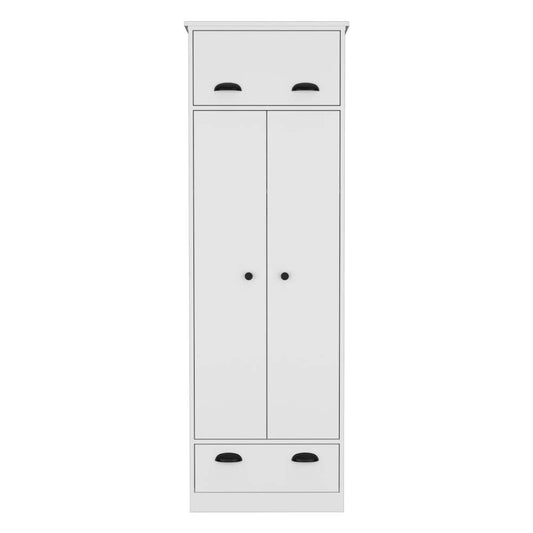 Dresser-closet with upper storage covered with 1 door, 2 central shelves, 1 tube for hanging clothes covered by 2 doors, 1 drawer at the bottom, White