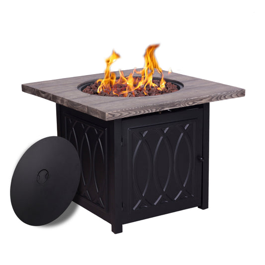 Faux Woodgrain Table top And Steel Base Propane Outdoor Fire Pit Table With Lid