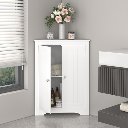 Floor Corner Cabinet with 2 Doors and Adjustable Shelves, Freestanding Narrow Cabinet Organizer, Corner Storage Cabinets for Bathroom, Kitchen, Living Room, or Bedroom, White