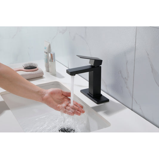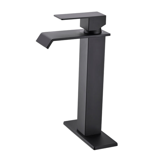 Waterfall Bathroom Faucet Black Single Handle Bathroom Sink Faucets 1 or 3 Hole Solid Vanity Faucet with Deck Plate & Overflow Pop Up Drain Matte Black