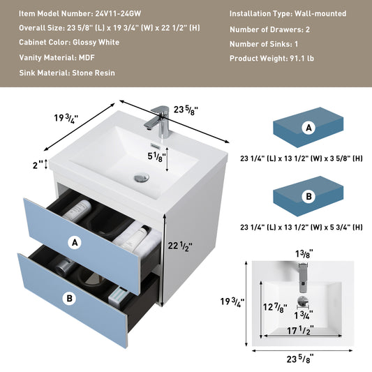 24" Floating Bathroom Vanity with Sink, Modern Wall-Mounted Bathroom Storage Vanity Cabinet with Resin Top Basin and Soft Close Drawers, Glossy White 24V11-24GW