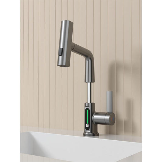Pull-Out Lift LED Temperature Digital Display Bathroom Basin Faucet, Single Handle 360° Rotatable Waterfall 3-in-1 Basin Tap with Adjustable Height - Gray