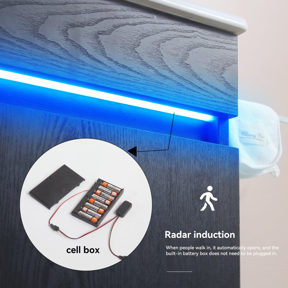 - The bathroom cabinet is equipped with a radar sensing battery box(Batteries not included) that automatically opens when people enter, and the built-in battery box does not need to be plugged in.