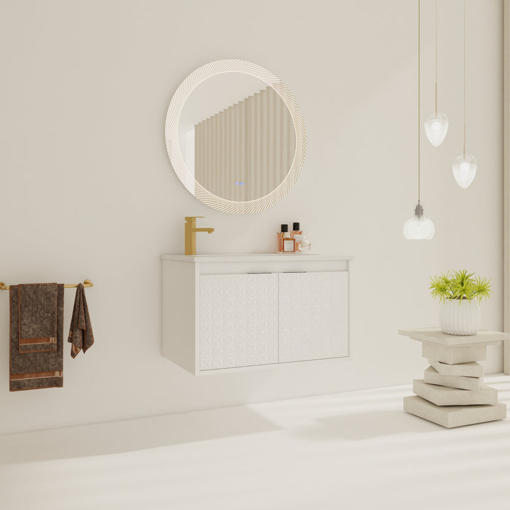 A white double-door wall-mounted vanity with a unique diamond-shaped textured surface. It comes equipped with soft-close door hinges, ensuring the doors close gently without making any noise, thereby extending its lifespan. The bottom storage space allows you to neatly store daily essentials or a laundry basket, making maintenance and cleaning a breeze.