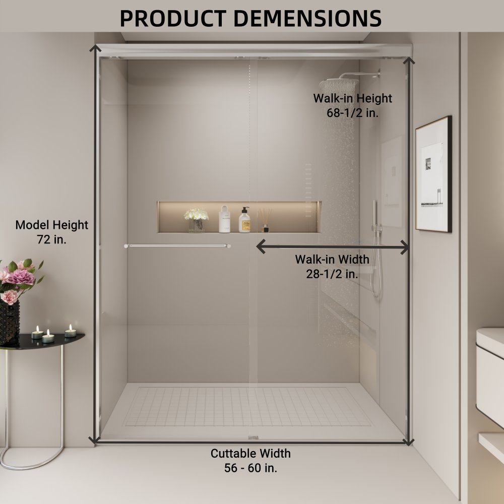 - Customizable Dimensions: The double sliding shower door measures 60" W x 72" H, adjustable from 56" to 60" by cutting the guide rail for a tailored fit.