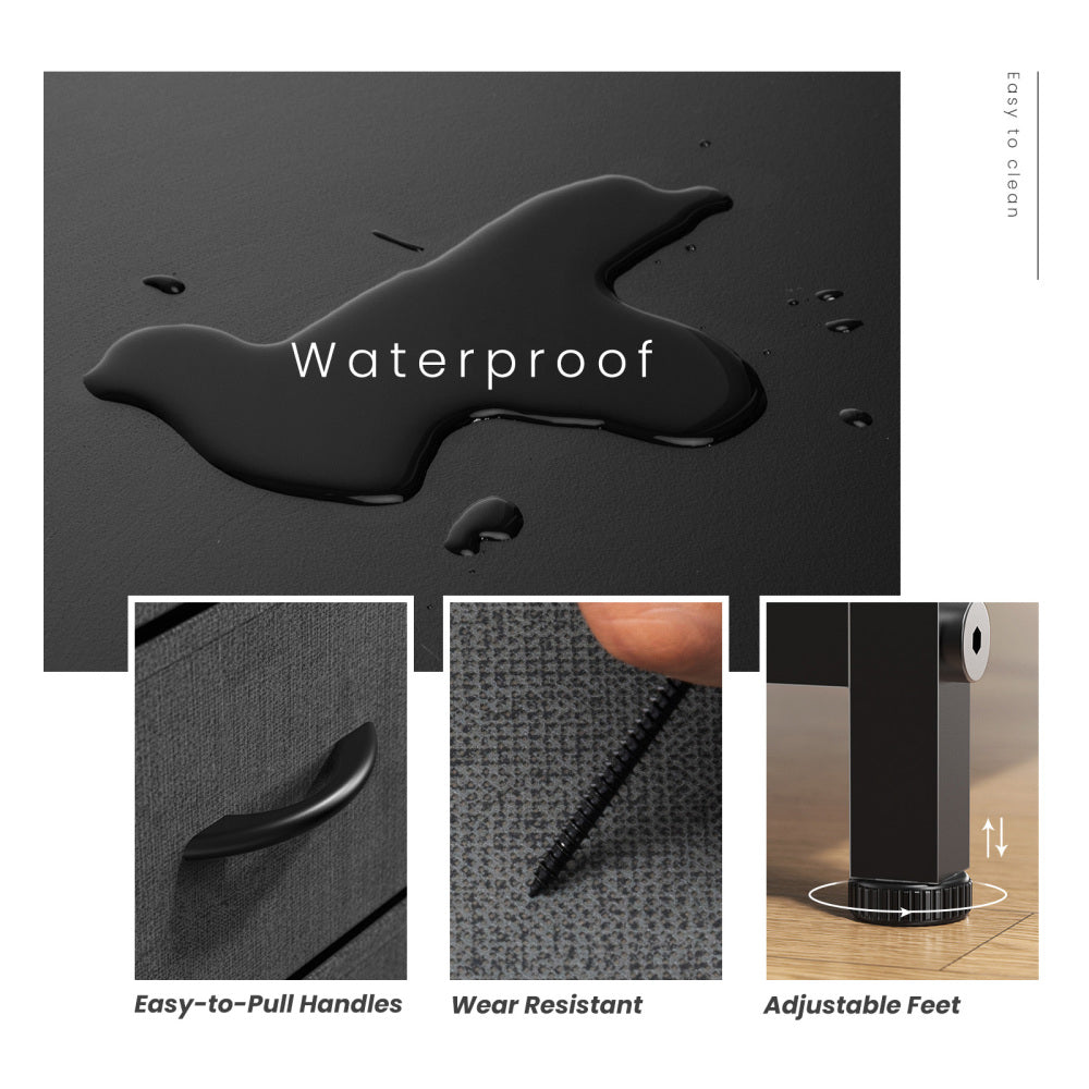 - Use a thick metal frame to keep the fabric dresser stable, with 4 adjustable feet to protect your floor from scratches, and you can adjust the balance of the chest of drawers in small areas. An auxiliary feature can be added if the dresser is attached to the wall, as it prevents uneven floors or tilting caused by children climbing.