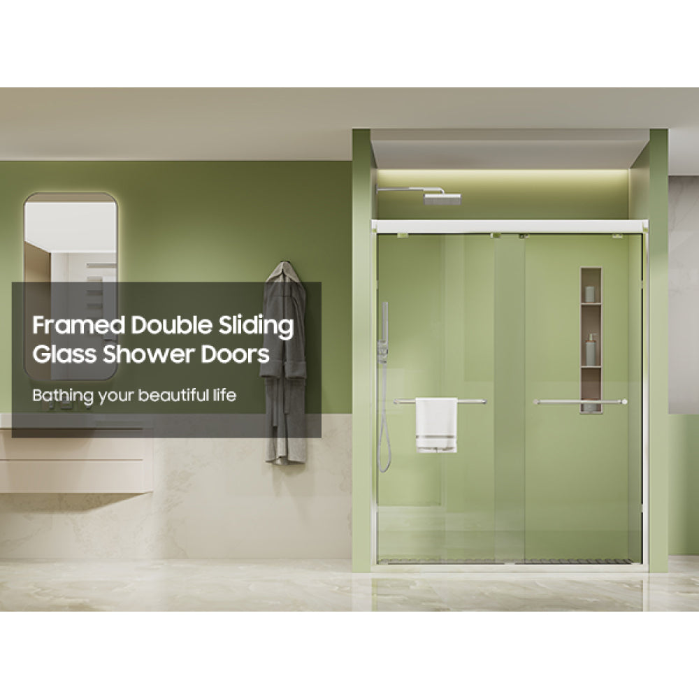 Framed Both Sliding Glass Shower Doors 60" Width x 76"Height with 1/4"(6mm) Clear Tempered Glass, Silver Finish, Big Rollers, Square Rail, Self-cleaning coating on both sides