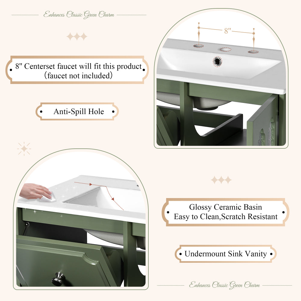 Retro Style 30'' Bathroom Vanity with Ceramic Sink Combo, Freestanding Single Vanity with 2 Drawers, Solid Wood Frame Bathroom Storage Cabinet, Green
