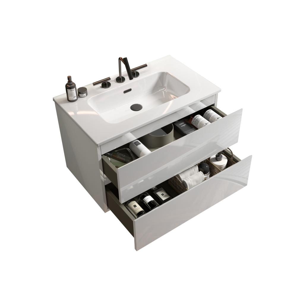 The double drawers maximize the use of space, offering a 20% increase in storage capacity to keep your bathroom essentials organized and within reach. And thanks to the DTC soft-closing silent drawer runners, you can enjoy a serene environment, free from disruptive noises. Featuring an integrated 45° sloping handle-free design, it embraces a minimalist approach to design. The glossy white cabinet enhances the visual appeal and creates a seamless look, adding a touch of modern refinement to your bathroom.